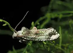 Male. — 18-20 mm. Head, palpi, and thorax whitish-ochreous. Antennae whitish-ochreous, spotted with black above. Abdomen whitish-ochreous irrorated with grey. Legs dark fuscous, ringed with ochreous- whitish, posterior tibiae ochreous-whitish. Forewings elongate, costa moderately arched, apex obtuse, hindmargin obliquely rounded; whitish-ochreous, irregularly suffused with light green; costa shortly strigulated with black from base to 3⁄4; some scattered black scales about fold; a large transverse tuft of scales towards inner margin at 1⁄4, followed by two black strigulae on inner margin; a second tuft near inner margin at h, followed by a black dot on inner margin; a third, smaller, above anal angle; a clear ochreous-whitish subtriaugular blotch on apical fourth of costa, containing some greenish scales towards apex, its lower angle obtuse, anterior and lower sides margined by an irregular wavy black line, preceded by a brownish suffusion : cilia ochreous-whitish, with a greenish line spotted with black (imperfect). Hind- wings whitish-grey, yellowish-shining; cilia whitish.[3]
