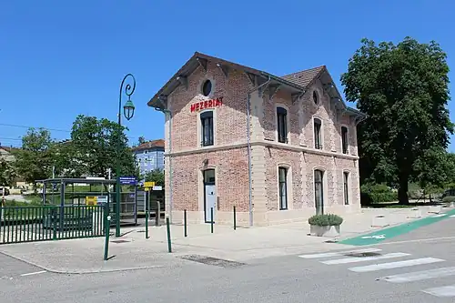 Mézériat station (French: Gare de Mézériat) is a railway station located in the commune of Mézériat, Ain department in the Auvergne-Rhône-Alpes region of France. It is located at kilometric point (KP) 21.476 on the Mâcon—Ambérieu railway, between the stations of Vonnas and Polliat.[1]