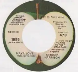 In December 1975, three months after the release of Harrison's Extra Texture album, "Māya Love" appeared as the B-side to that album's second single, "This Guitar (Can't Keep from Crying)".[71] Beatles author Bruce Spizer suggests that the selection of the year-old "Māya Love" was due to the lack of "hit candidates" on the melancholic Extra Texture.[72] "This Guitar" was Harrison's riposte to the harsh criticism levelled at him for his 1974 tour and the Dark Horse album,[73] particularly from Rolling Stone magazine.[74] This single, issued in February 1976 in Britain,[75] was the final release by Apple Records until its relaunching in the mid-1990s.[76] While opining that Dark Horse offers "a lot of rewarding listening … for those willing to listen with an open mind", Blogcritics' Chaz Lipp includes "Māya Love" among the highlights, describing the track as a "soulful R&B number that benefits from Willie Weeks' bass and Billy Preston's electric piano".[77]