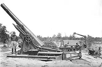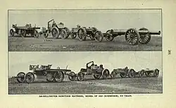 The M1918 was similar to most mobile siege cannons of World War I. With the exception of the caliber and a few minor details, it was an exact copy of the French 280 mm howitzer. It was moved in four large sections by heavy tracked ten ton tractors. There was also a fifth large load for the erection of the frame and other items needed to assemble the four main cannon components from their specialized transport wagons. The total weight of the five loads was 21.5 tons and was limited to a road speed of only 5 miles per hour. The first load was the 16-1/2 foot cannon barrel, the second load was the recoil mechanism, the third load was the carriage-aiming mount and the fourth the ground base. After a site was chosen, installation began with the handheld-tool digging of a large recoil pit, and then assembly of an iron beam erection structure over the emplacement pit. Under the best conditions, installation required four to six hours.[7][8][9]