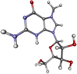 7-Methylguanosine (m7G) is a modified purine nucleoside. It is a methylated version of guanosine and when found in human urine, it may be a biomarker of some types of cancer. In the RNAs, 7-methylguanosine have been used to study and examine the reaction evolving methylguanosine. It also participates in the formation of 5'-cap that stabilizes mRNA and prevents its degradation by 5' exonucleases.[1][2]
