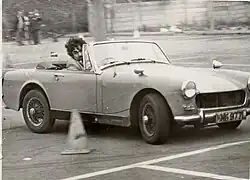 MG racing driver and garage owner Dick Jacobs persuaded Abingdon to build a pair of special lightweight Midgets with a GT body shape inspired by the Aston Martin DB4. The roof used the front part of the standard Midget hardtop, while the rear portion and the windshield were custom. A quick release fuel filler was placed beneath the rear windshield to the right.[11] The nose was redesigned by Syd Enever to improve the aerodynamic efficiency—wind tunnel tests showed that the new body required 13 hp less to achieve 100 mph than the standard body shape. The cars were registered BJB 770 and BJB 771. A third car was constructed for John Milne of Scotland and all three cars survive. The two loaned to Dick Jacobs were originally fitted with 979 cc A-series engines with twin Webers and approximately 80 hp (60 kW).[11] As campaigned from 1962 to 1963 they received 997 cc (Formula Junior-spec.) BMC A-series engines. For the 1964 season they ran the larger Formula Junior engine at 1139 cc, with a 1287 cc engine using a block derived from the Mini-Cooper 'S' available for events where the coupés ran as prototypes. They were fitted with 18.5-imperial-gallon (84 L) fuel tanks, larger oil coolers, large-bore exhaust systems and dual-circuit brakes.[12][13]