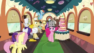 ![]() Pinkie Pie (right), determined to figure out who ate the Cakes' cake, questions the passengers on the train. | |