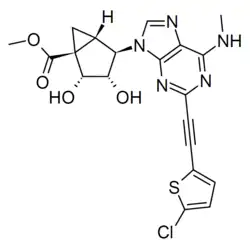 - ^ Tosh DK, Salmaso V, Rao H, Campbell R, Bitant A, Gao ZG, et al. (October 2020). "Direct Comparison of (N)-Methanocarba and Ribose-Containing 2-Arylalkynyladenosine Derivatives as A3 Receptor Agonists". ACS Medicinal Chemistry Letters. 11 (10): 1935–1941. doi:10.1021/acsmedchemlett.9b00637. PMC 7549272. PMID 33062176.