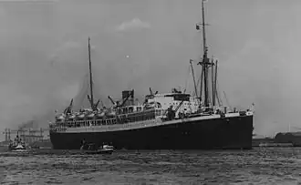 After the Netherlands had been occupied by Germany in 1940, Huygens port of registry was changed to Batavia.[13] She was placed under the management of the Orient Line and served as a troopship.[3] Carrying 1,290 troops, Christiaan Huygens sailed from Fremantle, Western Australia on 22 September with Convoy US 5, arriving at Suez, Egypt on 12 October.[14] She sailed from Suez on 28 October 1940 as a member of Convoy SW 2A, which dispersed off Aden on 1 November. Her destination was Bombay, India.[15] Christiaan Huygens left Bombay on 12 November with Convoy BN 8A, which arrived at Suez on 23 November.[16] She then joined Convoy BN 9A, which sailed on 30 November and dispersed off her destination of Aden on 5 December.[17]