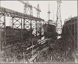 Christiaan Huygens was built as yard number 186[3] by the Nederlandsche Scheepsbouw Maatschappij, Amsterdam, North Holland, Netherlands. She was laid down on 13 March 1926.[4] She was launched on 28 September 1927, the biggest ship built in the Netherlands up to that date. On 11 December 1927 she was towed from the NSM yard to the drydock Hendrik Dok of Amsterdamsche Droogdok Maatschappij, where the propellers were added.[5]