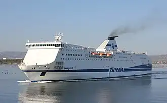 Nuraghes was the first of two sister ships, the other being Sharden. They are an improved version of the previous Bithia-class, with an additional car deck, bringing their gross register tonnage to nearly 40,000 GT, and allowing a greater cargo capacity (nearly 2,000 lane meters, equivalent to about 140 semi-trailers), or 1,085 cars. The ship can carry up to 3,000 passengers and has nine decks:[1]