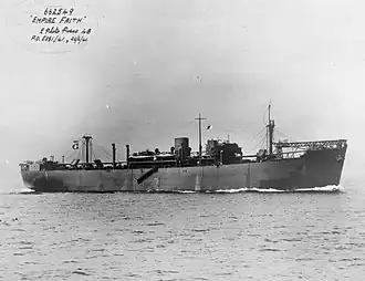 Empire Faith sailed on 1 January 1945 for Aden, arriving on 15 January. She departed on 28 January for Abadan, Iran, arriving on 4 February and departing nine days later for Karachi, India, where she arrived on 18 February. She sailed on 22 February for Bombay, arriving two days later. Empire Faith sailed on 5 March for Mombasa, Kenya, where she arrived on 14 March. She sailed a fortnight later for Diégo-Suarez, Madagascar, arriving on 31 March. On 4 April, Empire Faith sailed for Mauritius, where she arrived on 8 April. She departed on 26 April for Durban, South Africa, arriving on 2 May and sailing six days later for Port Elizabeth, arriving on 9 May. She departed on 12 May for Cape Town, arriving two days later and sailing on 16 May for Gibraltar, where she arrived on 5 June. She sailed that day for Liverpool, arriving on 10 June.[4]