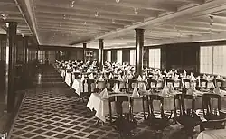 Meals on board were described in the travel brochure as "plentiful, nutritious and varied." As an example the shipboard menu for 30 May 1929 included cooked eggs, pancakes with applesauce, and oatmeal in milk for breakfast; broth with Tyrolean bacon dumplings, roast veal, young peas, potatoes, and California apricots for lunch; afternoon tea with filled bee sting cake; and schnitzel (Milan-style) for dinner. The full menu as well as normal drinking water was included in the cruise cost. There were additional charges for wine, beer, mineral water, liquor, and tobacco products.