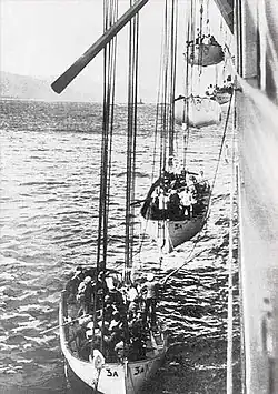 Immediately after Monte Cervantes slipped from the rock, the command was given to lower away the lifeboats from E-Deck. This initially resulted in a small panic among the passengers, but the crew explained that the 30 boats remaining would still be enough to receive an additional 500 passengers, and the anxiety was relieved. All 1,117 passengers and 255 of the crew members were successfully evacuated and began rowing against the wind toward Ushuaia. A passenger later reported that the rescue was not always pleasant: "...a high wind rose and enormous waves lifted us to a height of ten metres [33 feet], letting us fall again in great precipices, nearly turning over the boats. It was terrifying! The waves drenched us with glacial water, from head to toe. My legs were stiff and my right arm was paralyzed after clinging for so long to the edge of the boat."[1]