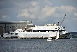 The completion of construction and fitting out of Honfleur was delayed by several years,[7] and she was still unfinished, with up to a year estimated to remain until delivery, when Brittany Ferries canceled their order for the ship in June 2020.[8] According to FSG, the incomplete vessel was under the shipyard's ownership at the time, leaving her fate unclear.[8] Subsequently it was reported that, as part of the restructuring of the shipyard, the unfinished ferry would be acquired by the former owner of FSG, Siem Industries, possibly for completion elsewhere.[9][10] On 25 October 2020, the former Honfleur (now simply known as FSG 774 after the cancellation) was towed out of the FSG shipyard by two tugs, the Svitzer Thor and Carlo Martello. She was taken to the Fosen Yard near Trondheim, Norway, which was tasked with finishing the cancelled vessel, after which she was to either be chartered or sold on to another operator.[11] Upon completion, she was laid up in Poland awaiting an operator.[12]