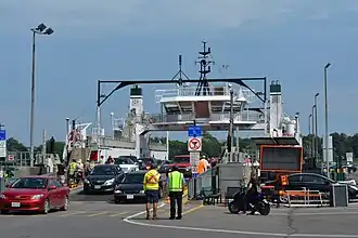 ![]() Vehicles loading off Wolfe Islander III at the ferry docks in Kingston harbour.