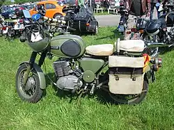 There was also a special model TS 250/1F for the Volkspolizei. The model had a large windshield, leg guards, individual seats and a side pannier. The radio was located on the other side, protected from the weather.[23] In 1980, special models were again made for the Volkspolizei. This time the radio was placed in the place of the pillion seat to improve handling.[24] Between 1976 and 1980, 399 of these special models were built, 220 of which were exported to Bulgaria.