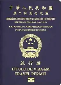 The Macao Special Administrative Region Travel Permit (Portuguese: Título de Viagem da Região Administrativa Especial de Macau, Chinese: 澳門特別行政區旅行證) is a biometric international travel document issued to non-permanent residents of Macao SAR holding Chinese nationality, who also possess a Macao SAR Non-Permanent Resident Identity Card, and are not eligible for any other type of travel document.[1] Permanent residents of Macao of non-Chinese nationality are also eligible.[2]