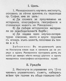 The Macedonian Scientific Institute also accepted a research programme and have published new collections of documents, monographs etc. Its membership consists of academics, professors, and public figures. It has bilateral relations with other organizations and especially with the Macedonian Patriotic Organization, as well as with scholars and scientific centres in Europe, the United States, Canada and Australia. The organization is also affiliated with VMRO-BND.[7] Its publications are translated and issued abroad. Professors Otto Kronsteiner (Austria), Tadeusz Szymański (Poland) and Heinrich Stamler (USA) were elected to be foreign corresponding members of the MSI. Scientific meetings, conferences and other activities are part of the renewed work of the Macedonian Scientific Institute.[8] The MSI works in collaboration with the Thracian Scientific Institute, likewise a Bulgarian scientific organization which studies the region of Thrace and the Bulgarian part of its population.[9] MSI has also developed scientific centers and branches in different cities in Bulgaria.