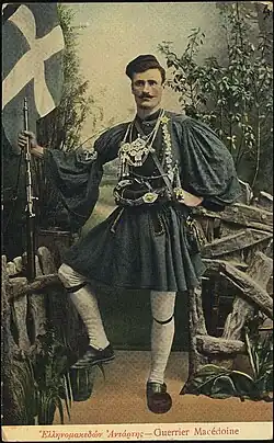 The Macedonians (Greeks) fought alongside the regular Greek army during the struggle for Macedonia, with many victims from the local population, to resist the Bulgarian expansionism and pan-Slavic danger.[37][38] There are monuments in Macedonia commemorating the Makedonomachi, the local Macedonian and other Greek fighters, who took part in the wars and died to liberate Macedonia from the Ottoman rule, officially memorialized as heroes.[39][40] Several of the Macedonian revolutionaries that were instrumental in the war later became politicians of the modern Greek state. The most notable of them were writer and diplomat Ion Dragoumis and his father Stephanos Dragoumis, a judge who became Prime Minister of Greece in 1910. The Dragoumis family, originating from Vogatsiko, in the Kastoria region, had a long history of participation in the Greek revolutions with Markos Dragoumis being a member of Filiki Eteria. Heroic stories from the Macedonian struggle were transcribed in many of the novels of Greek writer Penelope Delta, from narratives collected in 1932–1935 by her secretary Antigone Bellou-Threpsiadi, who was herself a daughter of a Macedonian fighter.[41] Ion Dragoumis also wrote about his personal recollections of the Macedonian struggle in his books. During the Population exchange between Greece and Turkey the Greek refugees settled mainly in Macedonia. The Greek refugees from Turkey constituted 45% of the population of Macedonia (Greece) in 1928.[42]
