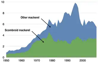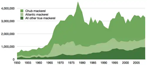 Global commercial capture of mackerel in millions of tonnes reported by the FAO 1950–2009[1]