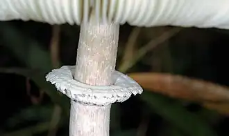 Cap: Around 15 cm wide, expanded with a wide umbo in the centre. The cap surface is white and smooth at the cap edges but cracking towards the centre whilst the umbo is brown with small warts. Gills: Free, broad and tan coloured from the spores but with colourless flesh when examined under a light. Stem: Around 18 cm tall and 2 cm thick running up into the flesh of the cap. Smooth and white and roughly equal in thickness across its length but with a bulbous base that is up to 4 cm thick. The stem is hollow but with slightly fibrous interior flesh. The persistent but movable stem ring is thick and large with membranous edges.[4]