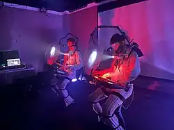 The most recent set of costumes feature the duo carrying their instruments with modified Pearl Drums marching snare carriers, wearing impact-resistant clothing and protective masks in case of injury, and wearing bionic wearable chairs to allow them to sit and rest while performing.[11][12] This setup also features camera feeds of their faces, this time displayed on circular plastic shields attached to their instruments, designed to mimic holograms. Due to their instruments being attached to them and the addition of the wearable chairs, they are able to stand up or sit down, and walk around the performing space freely, at times separating completely from one another.[12]