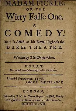Madam Fickle; Or, The Witty False One is a 1676 comedy play by the English writer Thomas D'Urfey. It was first staged at the Dorset Garden Theatre by the Duke's Company.