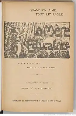 Like other feminists at the time, Madeleine Vernet associated feminism, pacifism and maternity. She saw maternity as a source of happiness and fulfillment, and thought that a woman who gave life could only be hostile to war, which took life away.[8] In October 1917 Madeleine Vernet founded La mère éducatrice, which she published until her death.[9] The review promoted the mother-educator ideology and gave advice on hygiene to the "mothers of the people".[10] The socialist and feminist Louise Bodin congratulated her, writing, "At the very dawn of life, there is mother and child, and, in a society not lost to egoism, vice and crime, everything should contribute to the veneration of the mother and child."[11] In October 1919 Mère Educatrice changed its subtitle from "popular education review" to "family education review".[12]