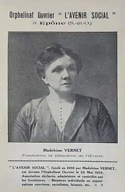 On 1 May 1906, thanks in part to her mother's savings, and helped by her sister and her companion Louis Tribier, Madeleine Vernet was able to found the orphanage l'Avenir social in a small house in Neuilly-Plaisance, Seine-et-Oise.[4] In August 1906 she rented a second house, since the orphanage now had twenty-four residents. By 1907 there were seventeen boys and thirteen girls. The orphanage was supported by the donations of friends, assistance from the cooperative La Bellevilloise, and subscriptions from Humanité and Guerre sociale.[1] In April 1908 she moved the orphanage to Épône, Seine-et-Oise. There she had to face opposition from the local clergy and harassment by the administration.[5]