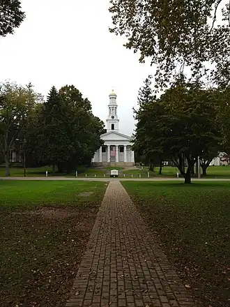 Madison Green is the town green of the New England town of Madison, Connecticut. The green is the centerpiece of the Madison Green Historic District,[2] and is located just west of the commercial strip of Madison on United States Route 1. The green is bounded on the south by US 1, Meeting House Lane on the east and north, and Copse Road on the west. Surrounding the green are several buildings, most prominent being the First Congregational Church (built in 1838). Other buildings around the green include Memorial Hall (1896), a community meeting building (c. 1884), Academy Elementary School (1884), and Lee Academy (1821), as well as many historic houses.