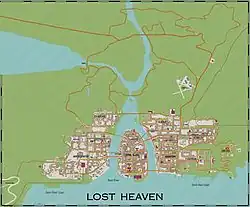 Mafia takes places within the fictional U.S. city of Lost Heaven, Illinois, during the final years of Prohibition in the 1930s. The West and East River divides the city into three boroughs: West Side (on the Saint Peter Coast), consisting of industrial buildings, the main port, and residential communities inhabited by Chinese and Italian immigrants; Central Island, dividing the river and consisting of the city's commercial district and municipal buildings; and East Side (on the Saint Paul Coast), consisting of both residential suburbs and slums, a bustling downtown district, and the city's local armory and stadium. The city features surrounding countryside that includes a hydroelectric dam, international airport, and a race circuit. The game's main story involves two major mafia families—the Salieri family, and the Morello family—who fight for control over the city's rackets in the wake of the demise of a third mafia family. Alongside the two groups, the city features a variety of smaller street gangs.