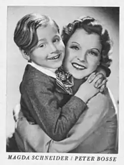 While filming in 1933, Schneider met her future husband, the Austrian actor Wolf Albach-Retty. The couple married in 1937 and had two children: Rosemarie Magdalena, called Romy, and Wolf-Dieter, later a surgeon, born in 1941. During World War II, Schneider lived in the Bavarian Alps near Hitler's retreat in the Obersalzberg above Berchtesgaden. Schneider was a guest of Hitler's, who declared that she was his favorite actress.[1][2] Later she and Albach-Retty separated and the marriage ended in divorce in 1945.