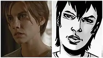 ![]() Maggie, as portrayed by Lauren Cohan in the television series (left) and in the comic book series (right). | |