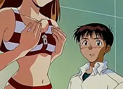 Asuka Langley Soryu showing her swimsuit, designed by Yoshiyuki Sadamoto, to Shinji Ikari discussing on thermal expansion. The presence of fan service has been criticized by some viewers and reviewers.