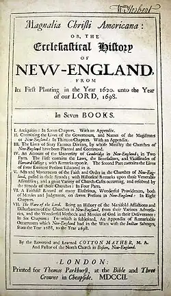 Magnalia Christi Americana (roughly, The Glorious Works of Christ in America) is a book published in 1702 by the puritan minister Cotton Mather (1663–1728). Its title is in Latin, but its subtitle is in English: The Ecclesiastical History of New England from Its First Planting in 1620, until the Year of Our Lord 1698. It was generally written in English and printed in London "for Thomas Parkhurst, at the Bible and Three Crowns, Cheapside."