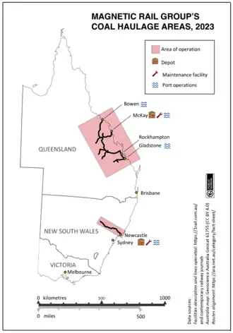 Magnetic Rail Group Pty Ltd is a rail freight company that hauls bulk coal in New South Wales and Queensland. It was incorporated on 1 November 2022 as an Australian proprietary company, limited by shares.[1] The company was formed as the corporate vehicle by which Magnetic Infrastructure Group Pty Ltd, an Australian incorporated 50‍–‍50 joint venture ultimately owned by M Infrastructure Group Pty Ltd and PT Asian Bulk Logistics, would manage the former One Rail Australia coal haulage assets that it was in the process of acquiring.[2][3] One Rail Australia had hauled about 30 per cent of Hunter Valley export coal volumes[2] and since 2020 had expanded its operations into Queensland.[4]