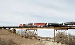 In 1908, the Canadian Northern Railway was built roughly along the Yellowhead Trail route and a railway station was established at Magnolia.[2] The Grand Trunk Pacific Railway was built on a path through Stony Plain and Wabamun, coming around the south side of Isle Lake, passing over the Magnolia Bridge, two miles south of the Magnolia townsite. The two railways ran in parallel west of Magnolia. The Canadian Northern Railway tracks were eventually torn out. The Magnolia Bridge was converted from wood to steel and is used by Canadian National Railways.