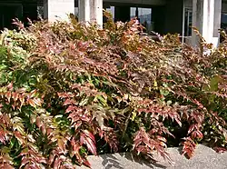 It is an evergreen shrub growing to 2 m (7 ft) tall by 3 m (10 ft) wide.[4] The foliage is pinnate, glossy dark green above, paler beneath, and sharply toothed. Each leaf usually has six to eight pairs of leaflets together with a single terminal leaflet. The plant produces new shoots regularly from the base, so it is clothed in foliage at all levels.