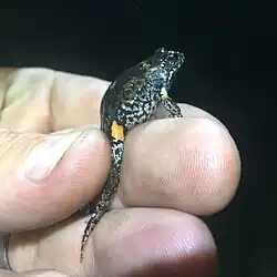 The species grows to about 35 mm in length (SVL). The upper body is brown to dark brown, which may be patched with grey, pale pink or orange-brown, and often has a triangular brown patch on the head. The tops of the arms are sometimes yellow. The belly is marbled black and bluish-white. The fingers and toes are unwebbed. The backs of the thighs and groin are bright orange.[3]