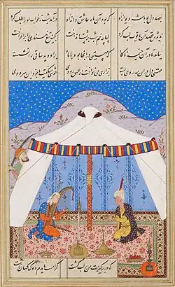 "Sultan Sanjar surprises his beloved entertaining Mahsati in his tent". Folio from the Majalis al-ushshaq, dated October/November 1552