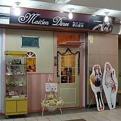 Maid cafés (Japanese: メイド喫茶 or メイドカフェ, Hepburn: meido kissa or meido kafe) are a subcategory of cosplay restaurants found predominantly in Japan and Taiwan. In these cafés, waitresses, dressed in maid costumes, act as servants, and treat customers as masters (and mistresses) as if they were in a private home, rather than as café patrons. The first permanent[1] maid café, Cure Maid Café, was established in Akihabara, Tokyo, Japan, in March 2001,[2] but maid cafés are becoming increasingly popular. The increased competition drove the cafes to employ more diversified themes, gimmicks and even unusual tactics to attract customers.[3] They have also expanded overseas to several countries, including the United States.[4]