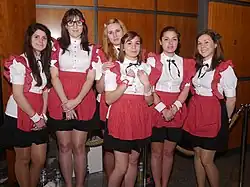 The maid costume varies from café to café but most are based upon the costume of French maids, often composed of a dress, a petticoat, a pinafore, a matching hair accessory (such as a frill or a bow), and stockings. Often, employees will also cosplay as anime characters.[7] Sometimes, employees wear animal ears with their outfits to add more appeal. Most commonly, manga style costumes are worn.[5]