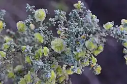Maireana pyramidata is a low, dense, stiffly branched shrub of a height from 0.3 to 1.5 m,[8][5] with finely woolly branches.[5] It is both dioecious and unisexual.[6][5] The leaves are alternate, narrowly cylindrical[5] and covered with a mixture of dendritic (tree-like structure) and simple hairs.[5] It fruits from August to November.[5]