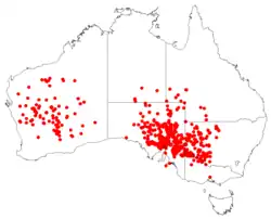 In Western Australia, it is found in the IBRA regions of Avon Wheatbelt, Carnarvon, Coolgardie, Gascoyne, Gibson Desert, Great Sandy Desert, Great Victoria Desert, Little Sandy Desert, Murchison, Nullarbor, Pilbara, and Yalgoo.[8]