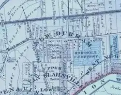 The area, which was one of the most populous sections of the township of Bergen,[8] was referred to as Maisland for 135 years,[9] when in the year 1803, Maisland became known as New Durham, which later on became part of North Bergen, New Jersey.[10] Maisland today constitutes the same area as New Durham did, which is bounded roughly by the beginning of Union Turnpike, Bergen Turnpike, and the Tonnelle Avenue Station of the Hudson Bergen Light Rail.[11] Within its vicinity during Maisland's frame of time was the Three Pigeons Tavern,[12] which stood at the southern fringe of Maisland near the intersection of Tonnelle Avenue and Hackensack Plank Road,[13] and the "Frenchman's Garden". This garden in Maisland, which later became Machpelah Cemetery,[14] was the early source for Lombardy poplar Populus nigra, which spread across the United States.[8][15]