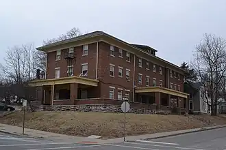 Major Hotel, also known as Colonial Hotel and Franklin House Apartments, is a historic hotel located at Liberty, Clay County, Missouri. It was designed by the architectural firm Keene & Simpson and built in 1912. It is a three-story, rectangular brick building with Colonial Revival and Prairie School style design elements. It features a low-pitched, hipped roof with wide, overhanging eaves and shed-roof dormers and one-story/ full-length verandah porch. It was rebuilt after a fire in 1934 and converted to a 21-unit apartment building in 1987.[2]: 5–7
