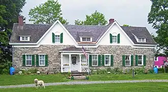Its original section is the front block, a one-and-a-half-story with 20-inch (510 mm) thick load-bearing stone walls. A porch covers the front entrance between two of the three pairs of windows; the upper story has two large, wooden gabled dormers added later, between the three small shed dormers remaining from the original house. In the rear is another later addition, a section called the "outlet", after the Dutch "uitlayt", a one-story stone enclosure 12 feet (3.7 m) wide across the entire rear section, with its own basement.[2]