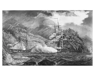 He joined the Royal Navy as a lieutenant in July 1799. In April 1802 he was promoted to Commander but not until September 1804 was he given his own ship: the 16-gun HMS Albacore. The ship operated in the English Channel guarding against French invasion (a true fear at that time) and was in the fleet of Admiral Saumarez based in Guernsey.[1] While in command of Albacore he came to public acclaim for the capture of five armed luggers off the coast of France on 4 October 1804.[2]