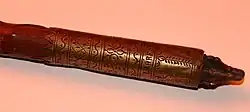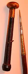 The makila walking stick consists of an engraved medlar wood shaft cut to a length to suit its owner, generally either hipbone or sternum-height, 1 to 1.4 metres (3.3 to 4.6 ft). The bottom is often shod with steel or other metal and ends in a ferrule (blunt spike for traction). The handle is also often covered with metal or woven leather to form a hand-grip, with a lanyard attached to the bottom of this grip. The stick is capped with a flattened knob or pommel, made of horn, steel, or bronze. The top portion consisting of the knob and hand-grip can be pulled off the top of the stick, revealing a hidden spike or blade, which effectively turns the stick into a short spear. The pommel's shape is said to resemble the beret worn by the Basque shepherd.