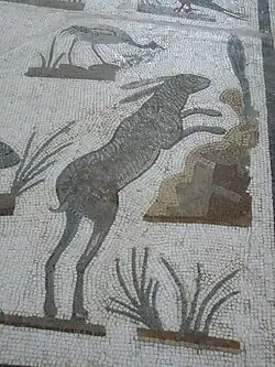 Pagan mosaics are displayed, including a large mosaic adorned with numerous animal motifs (birds and game). This theme is widespread in African mosaics from this period. Another mosaic depicts Venus bathing, the deity undressing, leaning against a tree, and surrounded by two cherubs bringing her flowers. The work is remarkable for its light and shadow play.[3] There are also fragments of sculptures, especially heads of emperors or deities, showing degradation signs. A lion, dating back to the 1st century and belonging to an older Numidian-Punic tradition, is visible, although a better-preserved specimen is located in the Bardo National Museum.[4]