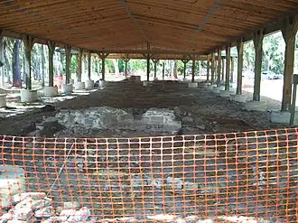 Hernández' country residence was the plantation house at Mala Compra,[4] a 1 1/2-story frame structure built on a coquina block foundation measuring 18 by 30 feet and laid three feet deep; the side facing the river had a long, wide porch. The interior of the house had two fireplaces built of brick and coquina, plastered walls and paneled doors. The detached kitchen was also 18 by 30 feet, it had a terraced first floor and a loft used for curing tobacco. There was a wooden-framed warehouse for cotton on the property that could hold 200,000 pounds of seed and 200 bales of ginned cotton. Agricultural equipment included single- and double-horse gins and 24-foot-gins,[10] in which the horses trod a path 24 feet in circumference. There were other buildings including a corn crib, a driver's house, and a privy, as well as cabins for people enslaved as forced laborers.