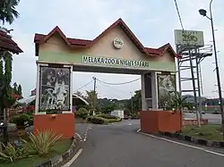 Malacca Zoo (Malay: Zoo Melaka), officially known as the Melaka Zoo and Night Safari,[a] is a 54-acre (22 ha) zoological park located beside Ayer Keroh Highway (Federal Route 143, also known as Tun Abdul Razak Road) in Ayer Keroh, Malacca, Malaysia, which hosts more than 1200 animals including 215 species of birds, amphibians, reptiles, mammals.[3] It is the second-largest zoo in Malaysia behind the National Zoo of Malaysia, both were established in 1963. The zoo acts as both a rescue base and an animal sanctuary and was initially owned by the Malacca State Government, but its management was taken over by the Department of Wildlife and National Parks of Malaysia in 1979 and later opened to the public by the then Prime Minister, Mahathir Mohamad on 13 August 1987.[4]