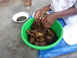 Malewa is boiled in water to clean it and then the joints of the shoot are cut off leaving the middle parts which are cut into smaller pieces. Rock salt is added to the boiled malewa to make it more tender. Finally peanut paste and salt are added and the sauce is simmered to acquire taste. The malewa sauce is served with Either matooke, cassava, sweet potatoes, rice or Posho.[3][4]